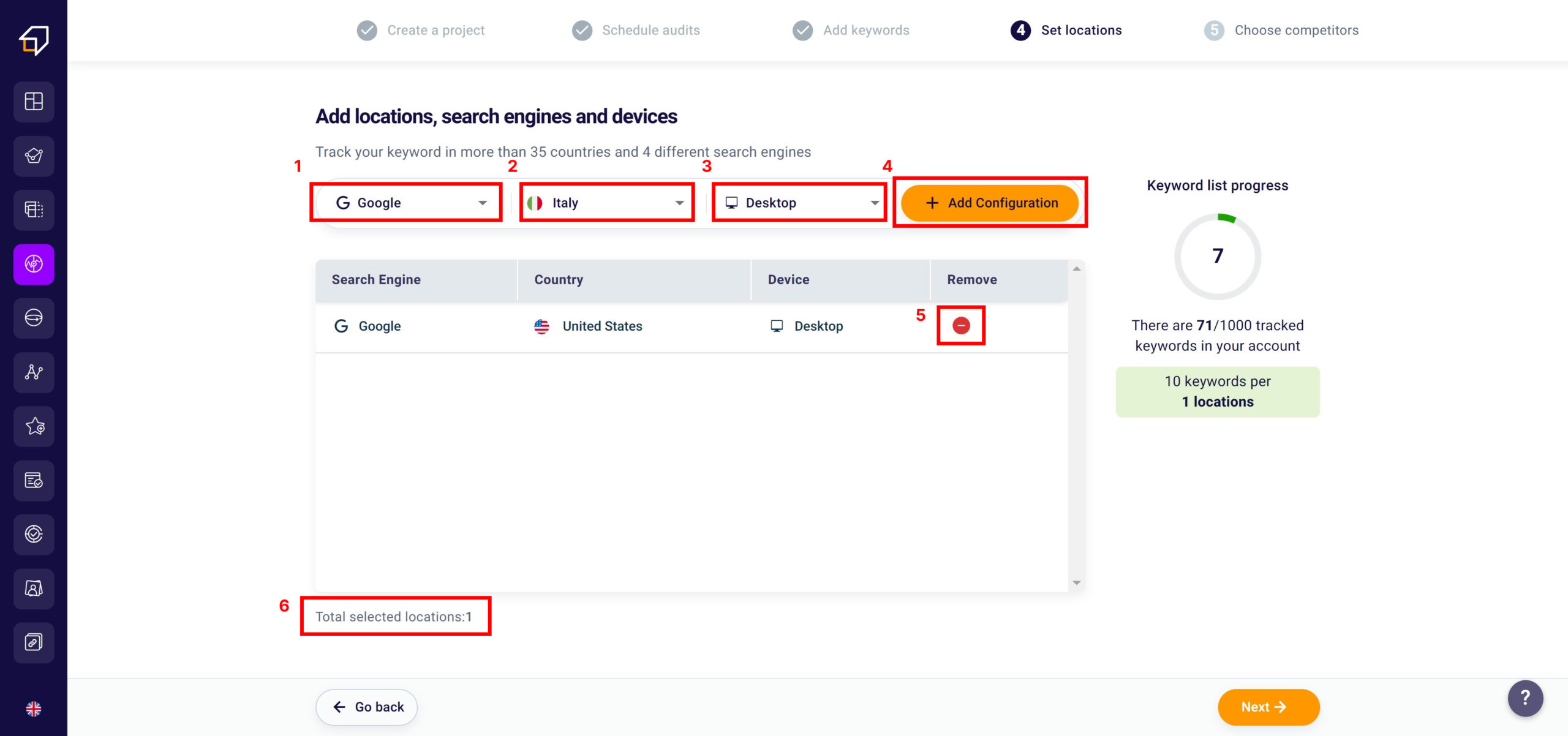 After choosing the new configuration for which to track your keywords, you will need to click on the orange button “+ Add configuration” (4).